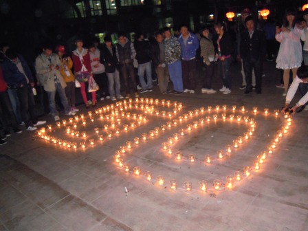 活動(dòng)當(dāng)晚20:30分,各公寓學(xué)生宿舍陸續(xù)展開熄燈接力。為了配合此次活動(dòng)的開展,學(xué)院自管會(huì)學(xué)生在思源堂廣場(chǎng)用蠟燭擺放出“60”(60分鐘)的字樣,同時(shí)還進(jìn)行了環(huán)保知識(shí)有獎(jiǎng)猜謎和播放“地球一小時(shí)”宣傳片活動(dòng)。
