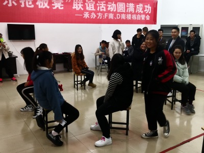 11月29日,F南樓與D南樓在F樓活動室開展“快樂搶板凳”活動,來自2個(gè)樓的70多名參與了此次活動。在活動中男生與女生相處融洽,體現(xiàn)了聯(lián)誼活動的趣味,充實(shí)了大家宿舍文化。