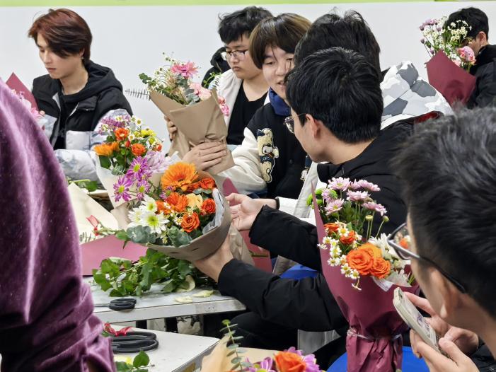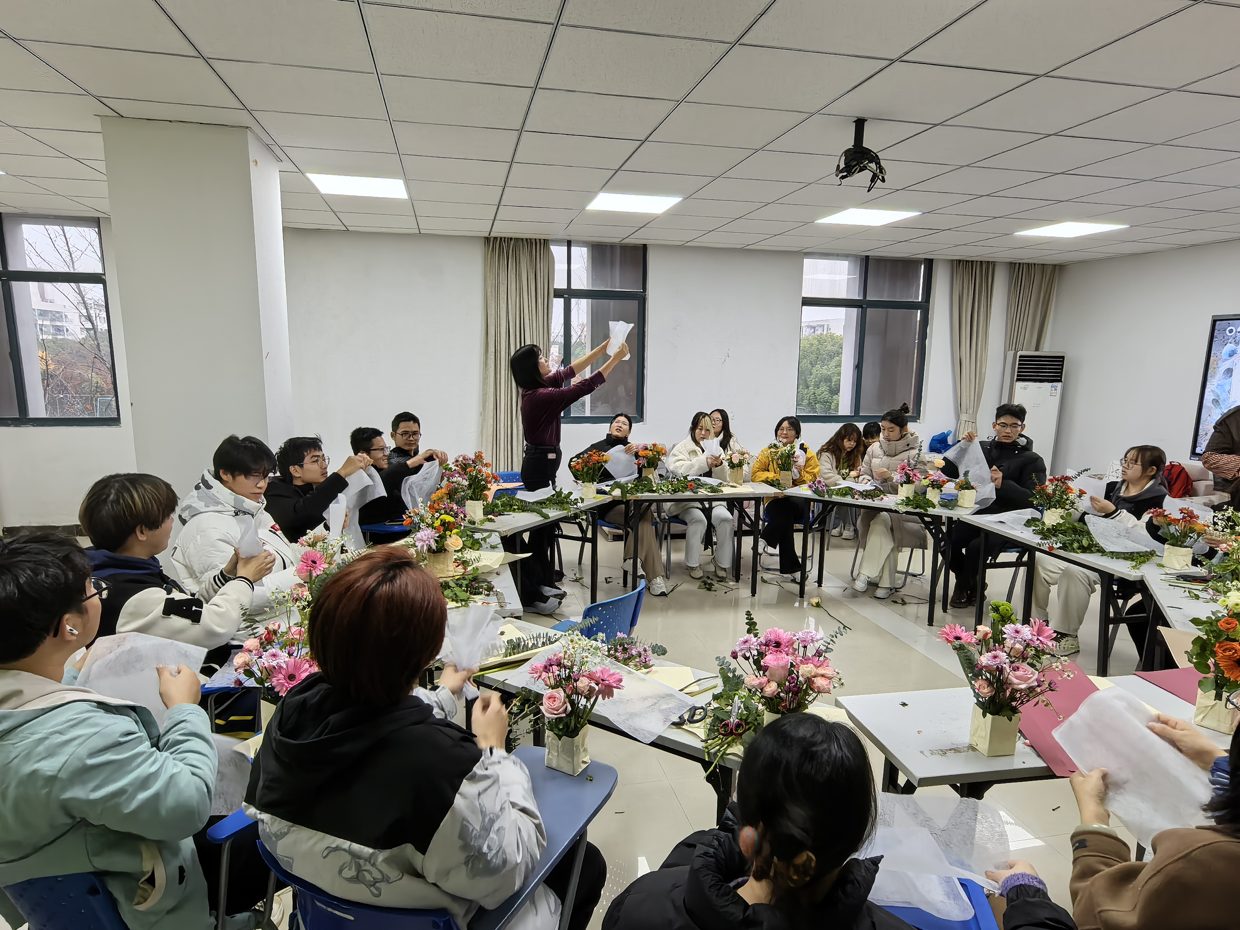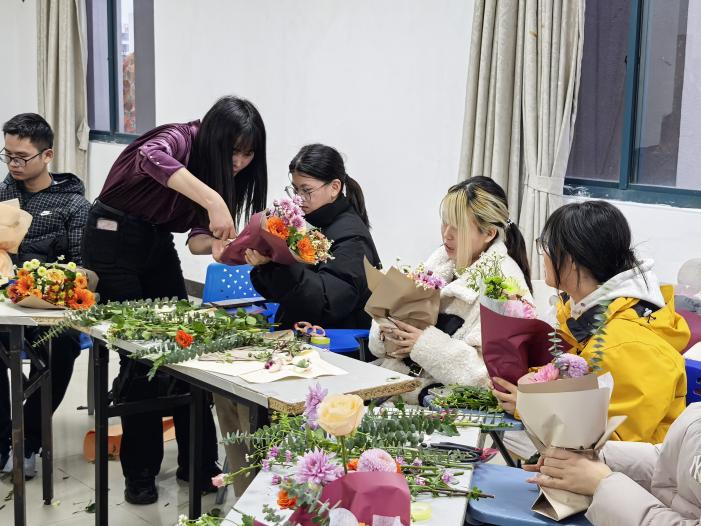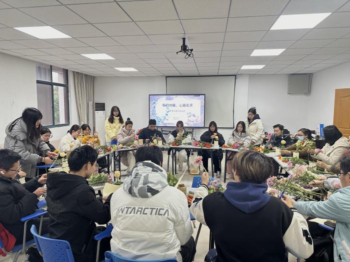 在冬日向暖,心路花開——冬季心理沙龍活動中,花藝?yán)蠋熸告傅纴砘ú?,花藝文化,插花的基本步驟和搭配知識等基本常識,指導(dǎo)參加沙龍活動的同學(xué)、老師如何處理和組合花材。每一位參與者都全情投入,在美育與勞動的沁潤下,沉浸于插花藝術(shù)帶來的心理愉悅,也在心理沙龍活動后,進(jìn)一步將積極陽光情緒繼續(xù)傳遞給他人。