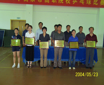南京市職業(yè)院校乒乓球比賽于2004年5月22日----23日在南京信息職業(yè)技術(shù)學(xué)院舉行。我院乒乓球隊(duì)經(jīng)過(guò)一個(gè)月的緊張刻苦訓(xùn)練,比賽中運(yùn)動(dòng)員經(jīng)過(guò)頑強(qiáng)拼搏,獲得男子團(tuán)體第一名,女子團(tuán)體第一名,為學(xué)院爭(zhēng)得了榮譽(yù),展現(xiàn)了交元學(xué)子風(fēng)采。參加比賽的運(yùn)動(dòng)員是: